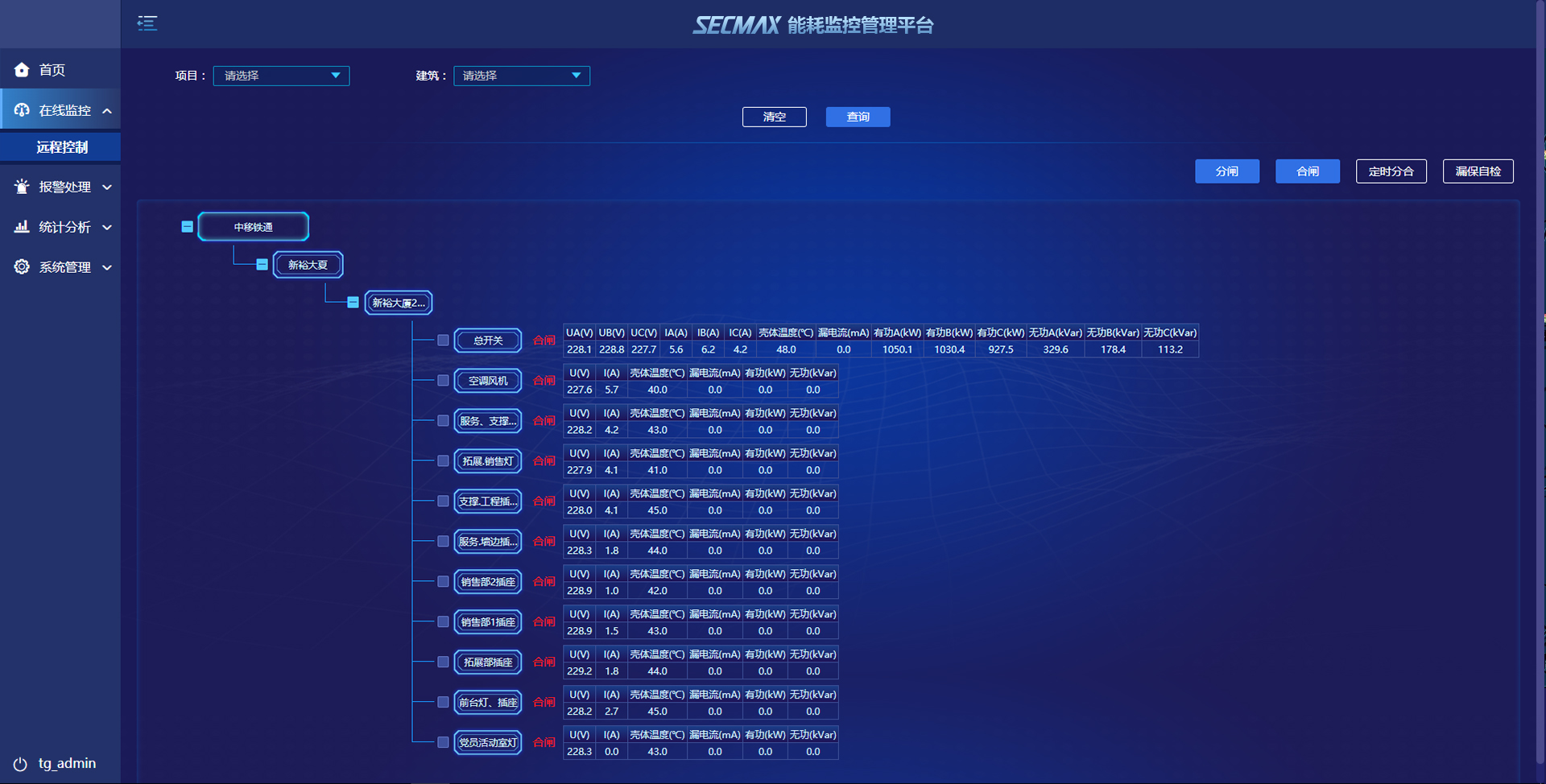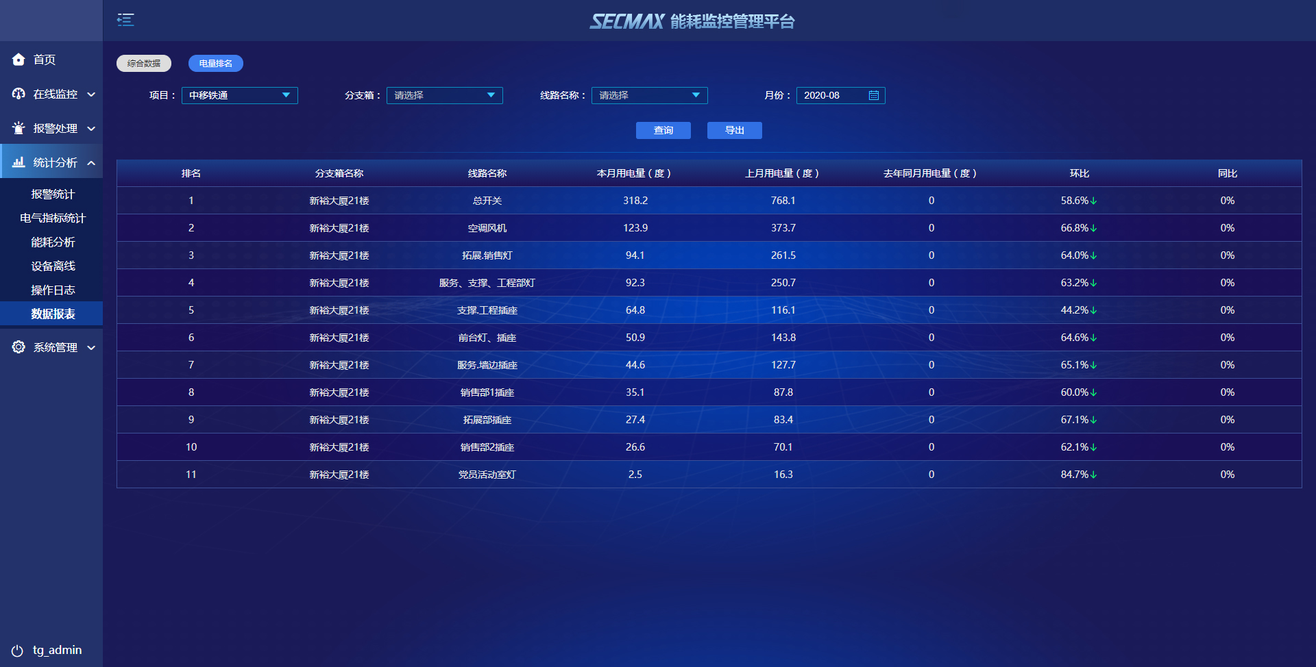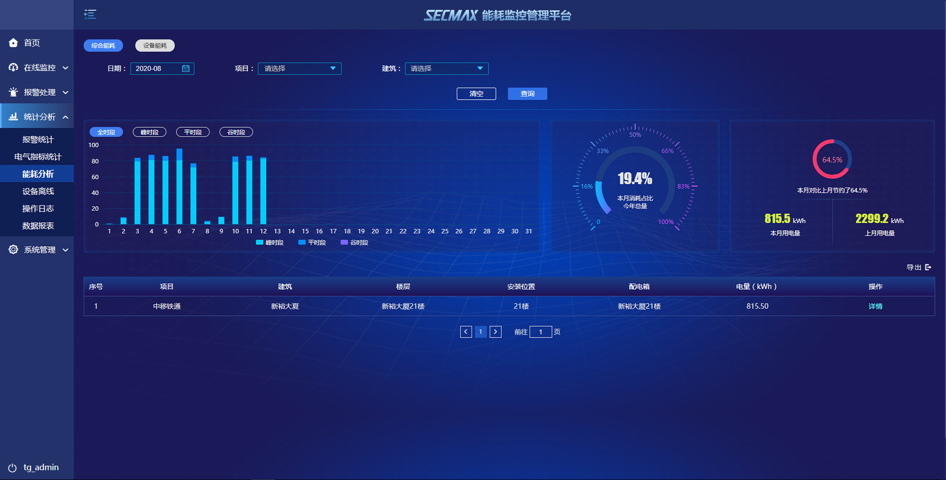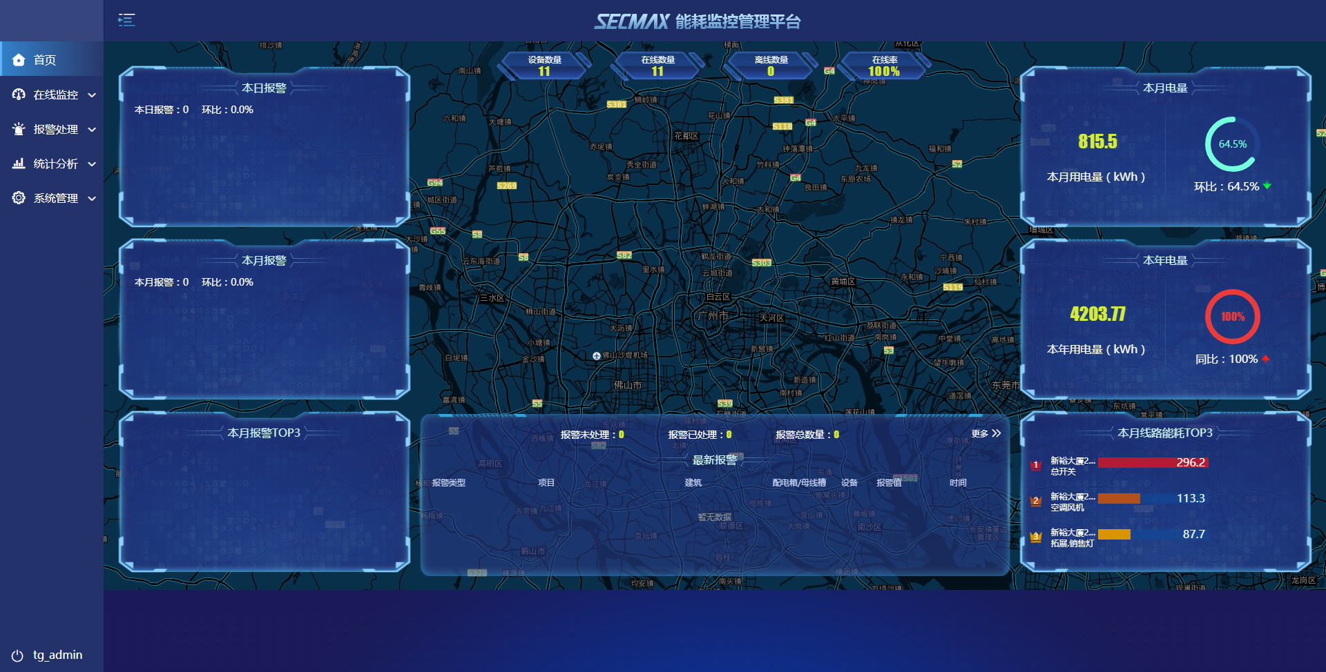 SECMAX-能耗監控管理憑條可直觀了解所有區域范圍內的能耗狀況,實時掌握單位能耗分布情況及數值,實現用能全面可視化,實時監測用能數據。SECMAX-能耗管理平臺可根據能源計量的實時信息對現場各單位的能源使用和消耗情況進行分析,并提供各種分析圖表。
