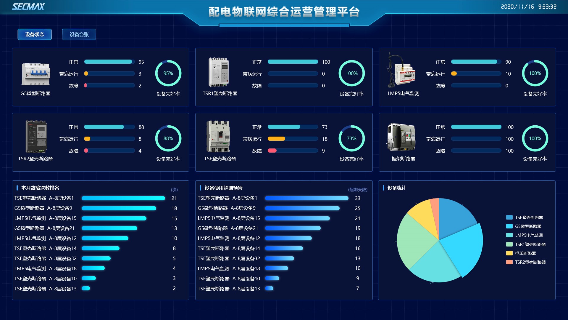 展示各類設(shè)備運(yùn)行狀態(tài)、設(shè)備故障次數(shù)排名、設(shè)備使用超期預(yù)警。