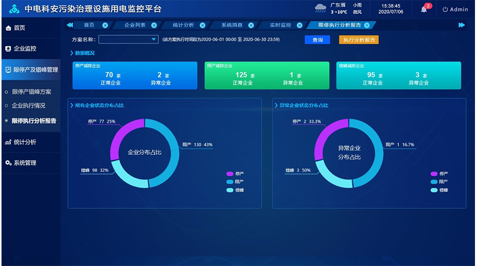 顯示限停產錯峰方案的執行分析報告、企業狀態數量統計及分布占比。
