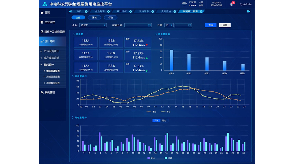 按企業、區域、行業三個維度統計在查詢時間內的用電能耗相關數據。