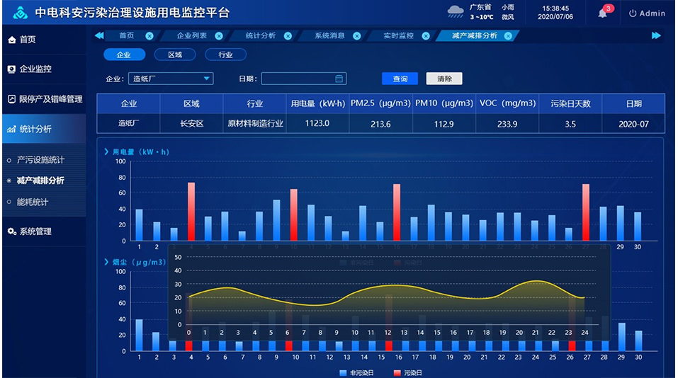 按企業、區域、行業三個維度統計在污染日、非污染日的用電量、煙塵、揮發性有機物對比,曲線以小時為單位展示相關參數的趨勢。