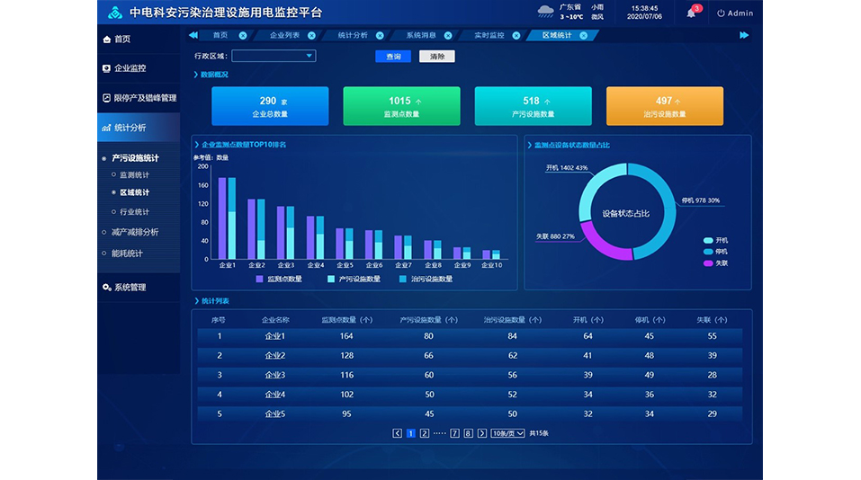 統計某一區域內企業數量、企業監測點數量及狀態。